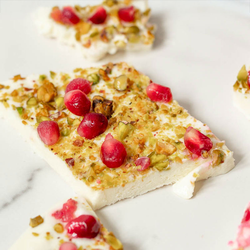One of my favorite things about this recipe is how pretty it is. The red pomegranate seeds and green pistachios give it that perfect holiday look! Break it into pieces and you’ve got a snackable, freezer-friendly dessert that’s easy on the stomach and great to keep on hand.
